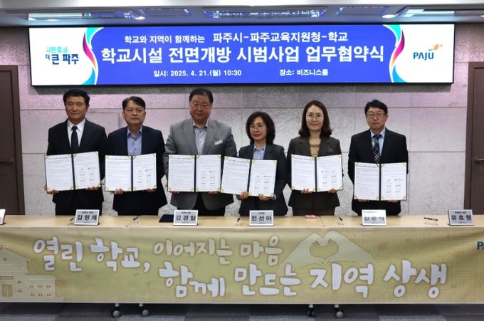 (아름다운교육신문) 경기도파주교육지원청은 파주시 및 신산초등학교, 적암초등학교, 청석초등학교, 심학고등학교 등 관내 4개교와 함께 '학교시설 전면 개방 시범사업 업무협약'을 체결했다.