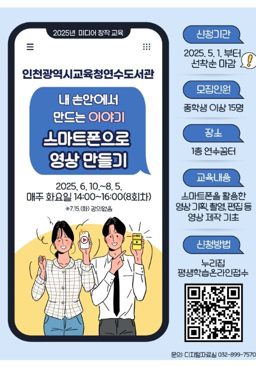 (아름다운교육신문) 인천광역시교육청연수도서관은 시민들의 미디어 창작 역량 강화를 위해 ‘내 손 안에서 만드는 이야기, 스마트폰으로 영상 만들기’ 교육 프로그램을 운영한다.
