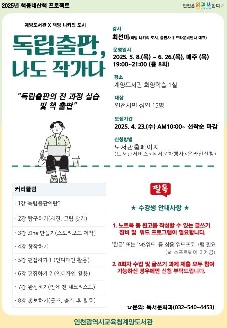 (아름다운교육신문) 인천광역시교육청계양도서관은 지역 서점 ‘니키의 도시’와 협력해 오는 5월 8일부터 6월 26일까지 매주 목요일, 8회에 걸쳐 글쓰기 프로그램 ‘독립출판, 나도 작가다’를 운영한다.