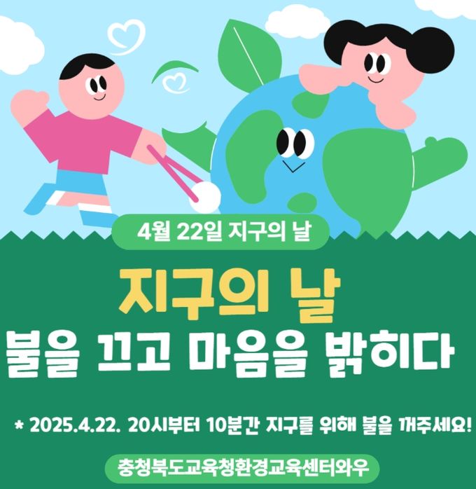 (아름다운교육신문) 충청북도교육청은 4월 22일 지구의 날을 맞아 본청을 비롯한 각급 학교는 저녁 8시부터 10분간 소등행사를 진행해, 환경보호의 의미를 되새긴다.