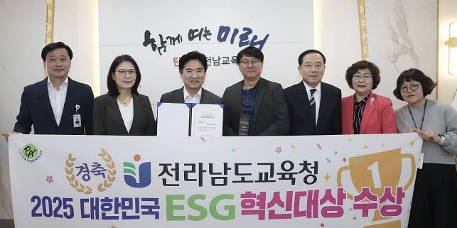 (아름다운교육신문) 전라남도교육청이 지난 18일 서울 대한상공회의소에서 열린 ‘2025 대한민국 ESG경제대상’ 시상식에서 공공기관 부문 ‘ESG 혁신 대상’을 수상했다.
