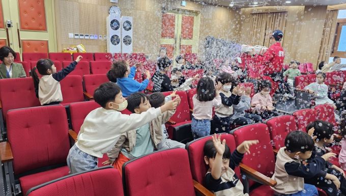 이번 버블쇼는 단순히 보기만 하는 버블쇼가 아니라 유아들이 직접 보고 만져보고 체험해 볼 수 있는 체험형 공연으로 구성되어 앉은 자리에서나 무대에서도 함께 참여해보는 시간이 됐다.