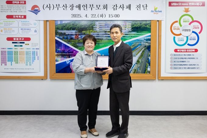(아름다운교육신문) (사)부산장애인부모회는 지난 4월 22일, 북구청 구청장 집무실에서 오태원 북구청장에게 감사패를 전달했다.
