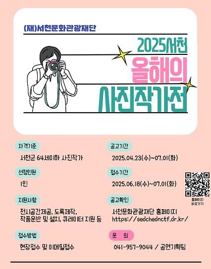 (아름다운교육신문) (재)서천문화관광재단은 지역의 사진 분야 활성화를 위해지역 사진작가를 선정하여 지원하는 '2025 서천 올해의 사진작가전'에 참여할 지역 사진작가를 공개모집한다.