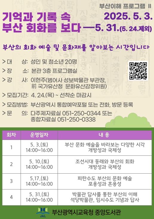 (아름다운교육신문) 부산광역시립중앙도서관은 오는 5월 3일부터 31일까지 도서관 3층 프로그램실에서 지역주민 20명을 대상으로 ‘기억과 기록 속 부산 회화를 보다’ 프로그램을 운영한다.