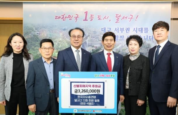 (아름다운교육신문) 대구 달서구는 한국자유총연맹 달서구지회로부터 산불 피해 지역 지원을 위한 후원금 326만원을 기탁받았다고 23일 밝혔다.