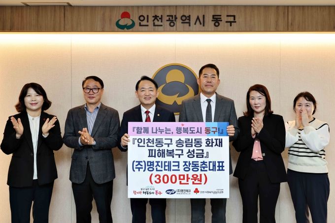 (아름다운교육신문) 인천 동구는 ㈜명진테크가 송림동 화재 피해 복구를 위해 성금 300만원을 지난 21일 기탁했다고 밝혔다.