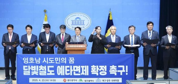 강기정 광주광역시장과 김정기 대구광역시장 권한대행, 광주·대구 지역 국회의원들은 23일 국회 소통관에서 ‘달빛철도 예비타당성조사 면제 확정’을 촉구하는 공동성명을 발표했다.
