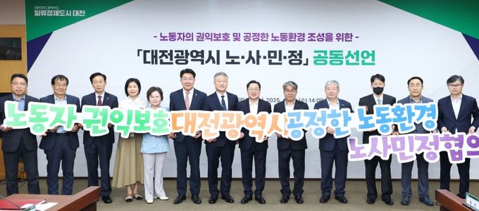 시는 이날 오후 2시 시청 5층 대회의실에서 이장우 시장과 노사민정협의회 위원 16명이 참석한 가운데, ‘2025년 상반기 대전광역시 노사민정협의회를 개최하고, 공정한 노동환경 조성을 위한 노사민정 공동선언을 공식 발표했다.