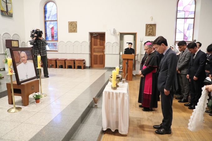 (아름다운교육신문) 김진태 강원특별자치도지사는 4월 23일 오후 3시 30분, 도청 간부 및 도청 내 천주교 신자 등으로 구성된 조문단과 함께 춘천 주교좌 죽림동 예수성심성당에 마련된 프란치스코 교황 분향소를 찾아 교황님의 선종에 깊은 애도를 표했다.
