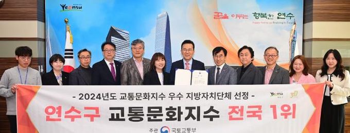 (아름다운교육신문) 연수구가 지난 23일 국토교통부 주관으로 한국교통안전공단이 실시한 ‘2024년 교통문화지수 평가’ 결과 자치구 부문 전국 1위를 달성하며 국토교통부 장관상을 받았다.