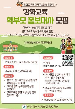 (아름다운교육신문) 인천강화교육지원청은 5월 2일까지 강화 관내 초·중학교 학부모를 대상으로 ‘2025 강화교육 학부모 홍보대사’를 모집한다.