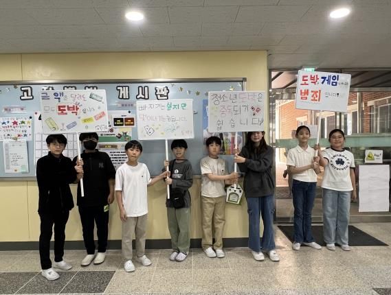 캠페인은 점심시간을 활용해 교내 주요 공간에서 진행됐다. 학생자치회 소속 학생들은 ‘도박은 게임이 아니라 범죄입니다’, ‘빠지기는 쉽지만 벗어나기는 힘듭니다’, ‘금액은 달라도 모두 도박입니다’ 등 도박의 유해성을 알리는 문구가 담긴 피켓을 직접 제작해 홍보 활동을 펼쳤다.