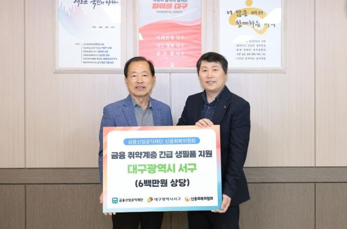(아름다운교육신문) 신용회복위원회 대구·경북지역본부는 지난 21일 서구청을 방문해 채무로 어려움을 겪고 있는 금융 취약계층을 위해 600만원 상당의 생필품을 전달했다.