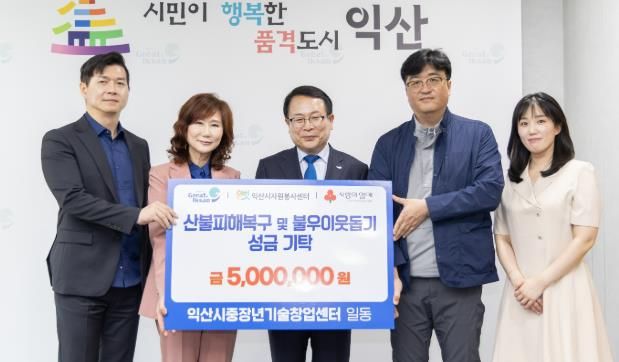 익산시는 익산시중장년기술창업센터가 산불 피해로 어려움을 겪고 있는 주민들을 지원하고, 지역 내 취약계층을 돕고자 성금 500만 원을 기부했다고 24일 밝혔다.
