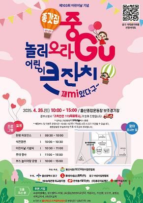 (아름다운교육신문) 제103회 어린이날을 맞아 2025년 ‘종갓집 중구 어린이 큰잔치’ 행사가 오는 4월 26일 오전 10시부터 오후 3시까지 울산종합운동장 보조경기장에서 열린다.