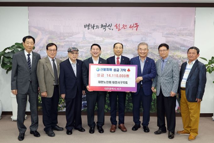 한편, 대한노인회 대전서구지회는 이날 기탁한 1,411만 원 외에 대한노인회 대전시연합회를 통해 기탁한 220만 원을 포함, 총 1,631만 원의 성금을 지원하여 산불 피해 복구 지원에 힘쓰고 있다.