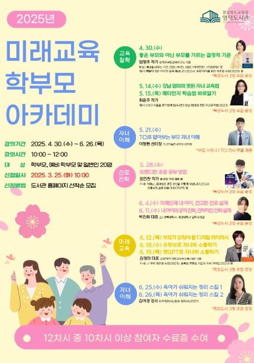 (아름다운교육신문) 경상북도교육청 영덕도서관은 학부모 및 예비 학부모, 일반인을 대상으로 '2025년 미래교육 학부모 아카데미' 강좌를 이달 30일부터 운영한다고 밝혔다.