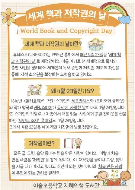 (아름다운교육신문) 이솔초등학교는 유네스코가 지정한 ‘세계 책과 저작권의 날’을 맞아, 4월 18일부터 25일까지 다채로운 독서문화 행사를 실시했다. 학생들은 행사 참여를 통해 책과 가까워지는 시간을 가지면서 저작권의 의미를 되새겨 보는 기회를 가졌다.