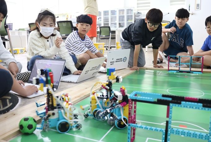 ‘스파이크 프라임’ 수업에서는 로봇 교육 플랫폼의 기본 원리를 학습하고, 축구 로봇을 조립해 실제 축구 경기를 진행하며 창의적 설계력과 협동심을 기를 수 있었다.
