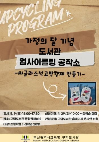 (아름다운교육신문) 부산광역시립구덕도서관은 가정의 달을 맞아 오는 5월 9일 오후 4시 초등학생 1~3학년 20명을 대상으로 도서관 문화강좌실 2에서 ‘도서관 업사이클링 공작소’를 운영한다.