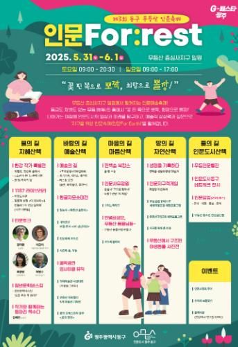 (아름다운교육신문) 광주 동구가 오는 5월 31일과 6월 1일 이틀간 무등산 증심사 지구 일원에서 ‘제3회 동구 무등산 인문축제’ '인문For:rest'를 개최한다고 밝혔다.