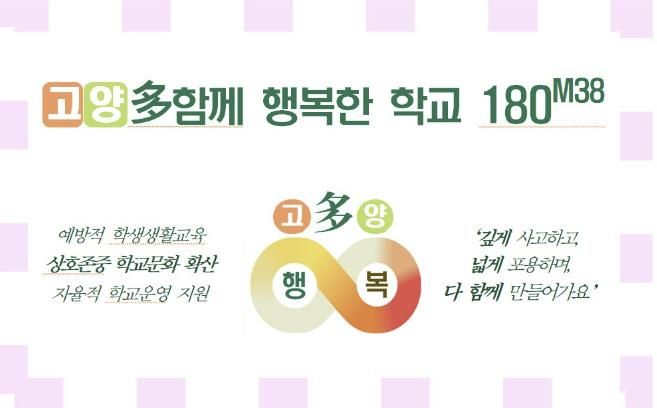 고양교육지원청 이현숙 교육장은 “고양‘多함께 행복한 학교 180M38’은 학생과 교원의 주도로 상호존중을 통한 학교공동체 문화를 구축하고, 이러한 공동의 학교문화를 통해 학교 구성원들은 행복한 교육공동체로 성장할 수 있다”며 “고양 교육공동체 모두의 권리와 책임을 바탕으로 ▲다함께 행복한 교육의 꽃을 피울 수 있도록 적극 지원하겠다”고 밝혔다.