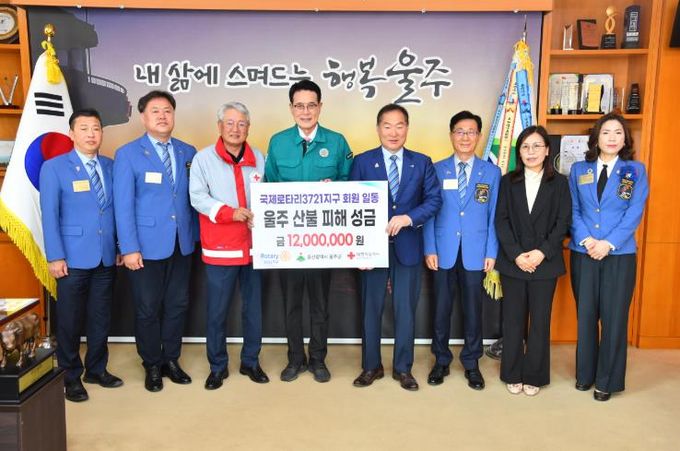 국제로타리 3721지구 김기훈 지구총재는 이날 울주군을 방문해 울주군 산불 피해 이재민을 돕기 위한 성금 1천200만원을 전달했다.