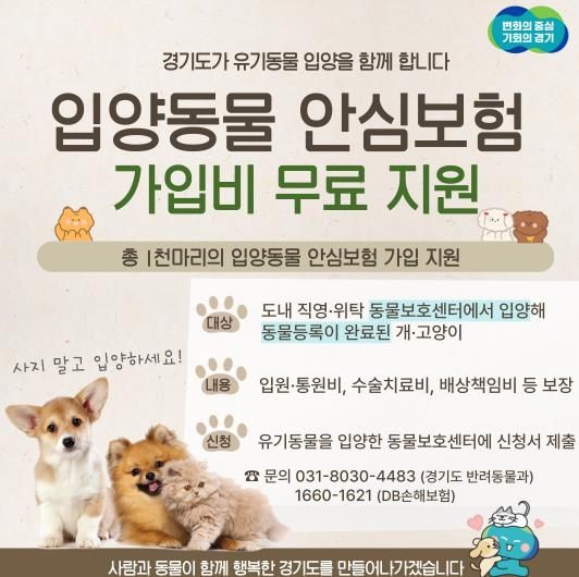 지원 대상은 올해 1월 1일부터 경기도내 도·시군 직영 또는 위탁 동물보호센터에서 입양된, 동물등록이 완료된 개와 고양이로, 유기동물을 입양 받은 공공 동물보호센터에서 가입 신청을 할 수 있다. 민간 입양시설이나 경기도 외 동물보호센터에서 입양한 경우에는 보험가입 지원대상에서 제외된다.
