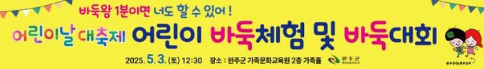 (아름다운교육신문) 완주군이 2025년 어린이날 대축제를 맞아 어린이들을 위한 다채로운 행사를 준비한 가운데, 어린이 바둑 체험 및 바둑대회를 특별 프로그램으로 운영한다.