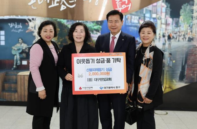 류규하 중구청장은 “대구한빛교회에서 보내주신 따뜻한 관심과 지원은 피해 지역 주민들에게 큰 힘이 될 것”이라며, “기탁해주신 성금은 사회복지공동모금회를 통해 피해 지역 복구와 이재민 지원에 소중히 사용하겠다”고 말했다.