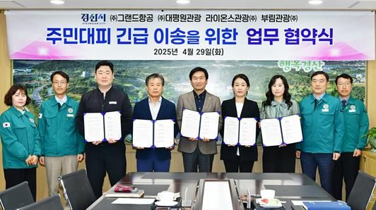 (아름다운교육신문) 경산시는 29일 시청 시장실에서 재난 및 비상상황 발생 시 신속한 주민 대피와 안전한 긴급 이송을 위해 관내 전세버스 운송업체 4개사[(주)그랜드항공, (주)대평원관광, 라이온스관광(주), 부림관광(주)]와 ‘주민대피 긴급 이송 협약’을 체결했다고 밝혔다.