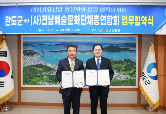 (아름다운교육신문) 완도군과 (사)전남예술문화단체총연합회가 해양치유산업 활성화와 협회 회원들의 건강 증진을 위해 손을 맞잡았다.