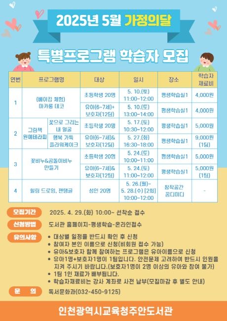 (아름다운교육신문) 인천광역시교육청주안도서관은 지역 주민을 대상으로 5월 10일부터 28일까지‘5월 가정의 달 특별프로그램’을 운영한다.