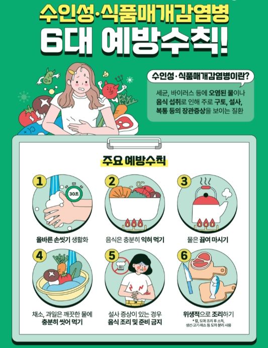 수인성·식품매개감염병을 예방하기 위해서는 안전한 물과 음식물을 익혀 먹고, 흐르는 물에 비누로 30초 이상 손 씻기 등 감염병 예방수칙 준수가 중요하다.