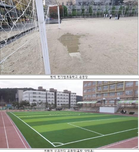 이번 사업은 노후화되거나 비포장 상태인 운동장을 개선하여 학생들의 체육 활동 및 야외 학습 환경을 질적으로 향상시키고, 미세먼지 등으로부터 안전한 교육 공간을 확보하기 위해 마련됐다. 한가람초등학교는 스포츠클럽활동의 활성화와 학교의 적극적인 참여 의지와 교육 환경 개선 노력 등을 인정받아 최종 사업 대상 학교로 선정되는 쾌거를 이루었다.