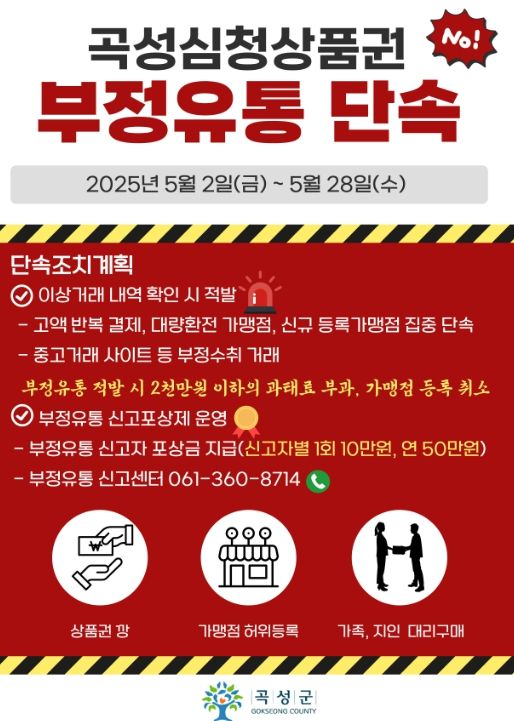 (아름다운교육신문) 곡성군이 오는 5월 7일부터 3주간 2025년 상반기 곡성심청상품권 부정유통에 대한 단속을 추진한다고 전했다.