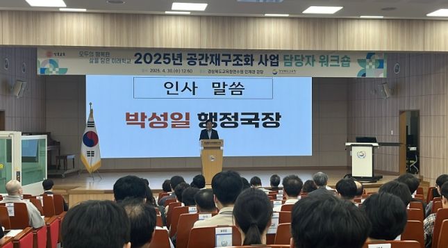 (아름다운교육신문) 경북교육청은 30일, 구미시에 있는 경상북도교육청연수원 인재관에서 ‘PRIDE-경북 미래학교 조성 사업, 진화를 꿈꾸다’를 주제로 2025년 공간재구조화 사업담당자 120여 명이 참석한 가운데 사업담당자 워크숍을 개최했다.