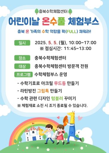 자연과학교육원 관계자는 “어린이날을 맞아 다양한 체험부스 운영을 통해 도내 학생, 학부모의 수학 문화 대중화에 기여하는 자리가 만들어질 것으로 생각한다. 앞으로도 다양한 프로그램을 통해 충북 수학 교육을 지원하도록 하겠다.”고 말했다.