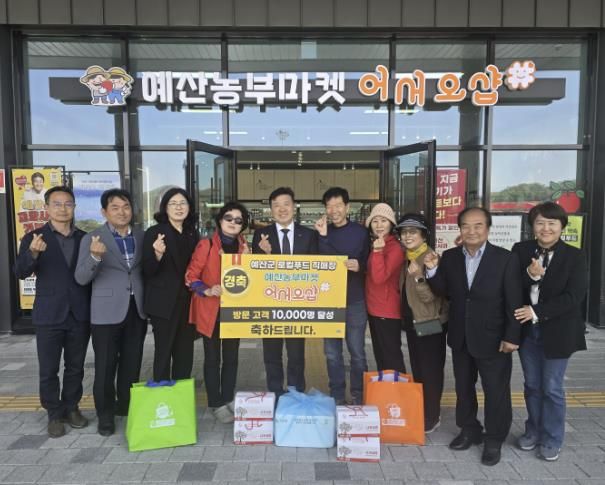 이날 예당호 로컬푸드 생산자 협의회(회장 백승준)는 방문 고객 1만명 달성을 기념해 방문객 김현이(군산시) 씨 가족에게 예산 명품 꾸러미 선물세트를 전달하고 감사의 뜻을 전했다.