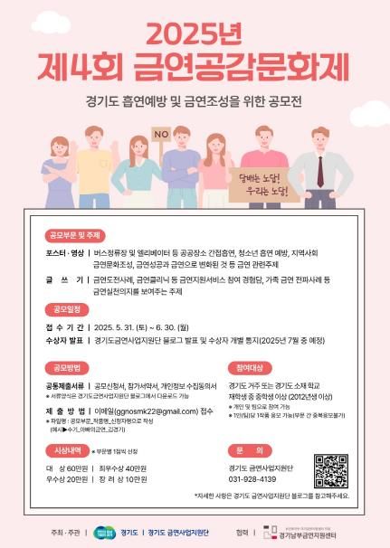 (아름다운교육신문) 경기도와 경기도금연사업지원단(을지대학교 산학협력단)은 경기남부금연지원센터와 협력해 ‘제4회 금연 공감 문화제’ 공모전을 개최한다.