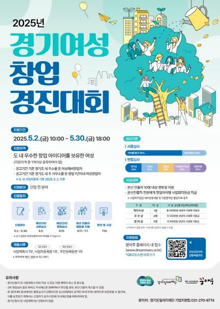 (아름다운교육신문) 경기도가 2025년 여성창업경진대회를 열어 여성 창업 활성화를 지원한다. 올해 대회는 사업화지원금 총액을 기존 1,650만원에서 2천만 원으로 증액하고, 시상 인원도 8명에서 10명으로 확대해 더 많은 여성 창업자에게 기회를 제공한다.