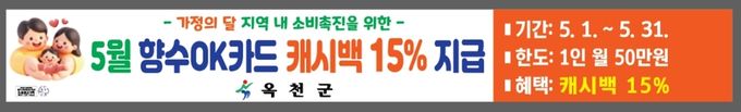(아름다운교육신문) 옥천군이 가정의 달 5월을 맞아 한달 동안 옥천사랑상품권(향수OK카드) 캐시백 혜택을 당초 10%에서 15%로 상향한다.