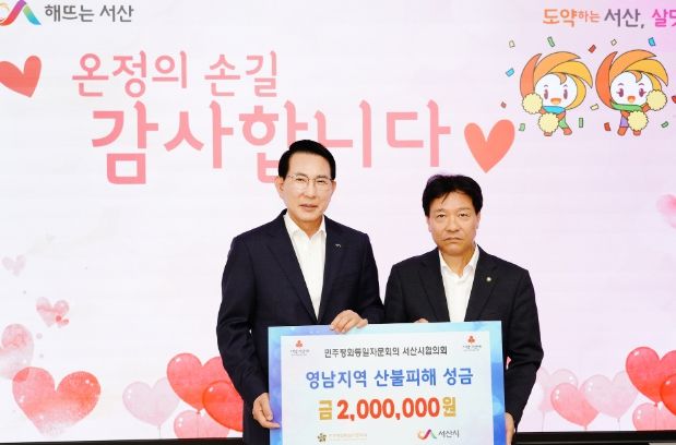 이번 성금은 갑작스러운 산불피해로 삶의 터전을 잃은 이재민들을 위하여 민주평통 서산시협의회 자문위원들의 자발적 모금으로 이 소중한 성금은 이재민지원, 산불피해지역 구호·복구 등에 사용될 예정이다.
