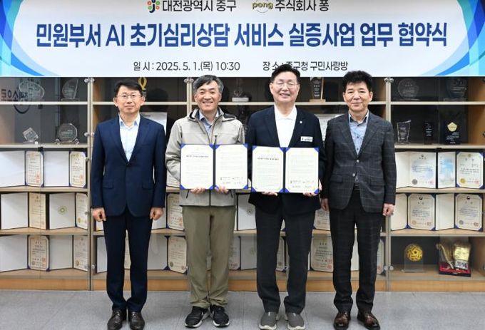 (아름다운교육신문) 대전 중구는 1일, 감정공감형 인공지능(AI) 기반 초기심리상담 서비스를 개발·운영하는 주식회사 퐁과 ‘민원부서 공무원의 심리회복 지원을 위한 AI 초기심리상담 서비스 실증사업’ 추진을 위한 업무협약을 체결했다고 밝혔다.