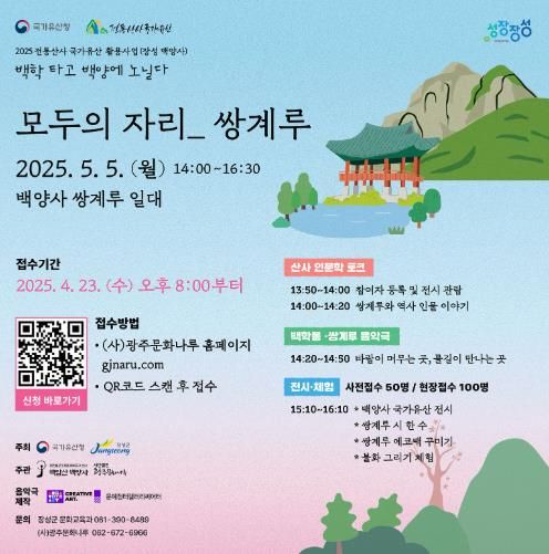 ‘모두의 자리, 쌍계루’는 국가유산청과 장성군이 주최하고 백양사, (사)광주문화나루가 공동 주관하는 ‘2025년 전통산사 국가유산 활용사업’의 첫 행사다.
