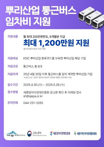 지원 대상은 세종시에 소재한 뿌리산업 기업이며, 총 6대의 통근버스에 대해 1대당 월 최대 200만 원 한도로 최대 6개월간 지원한다.