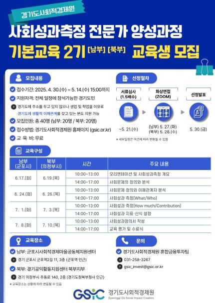 (아름다운교육신문) 경기도사회적경제원은 14일까지 ‘사회성과측정 전문가 양성과정 기본교육 2기’ 교육생 40명을 모집한다.