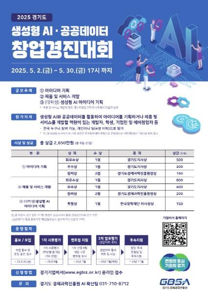(아름다운교육신문) 경기도는 생성형 인공지능(AI)과 공공데이터를 활용한 창의적 아이디어 발굴과 스타트업 육성을 위해 오는 30일까지 ‘2025년 경기도 생성형AI·공공데이터 활용 창업경진대회’ 참가자를 모집한다.