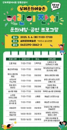 유희태 완주군수는 “삼례문화예술촌 어린이 잔치가 아이들에게는 즐거운 추억을, 가족들에게는 소중한 시간을 선물하는 계기가 되길 바란다”며 “미래의 주인공인 어린이들이 마음껏 뛰놀며 즐겁고 특별한 추억을 남길 수 있는 하루가 되길 바란다”고 말했다.